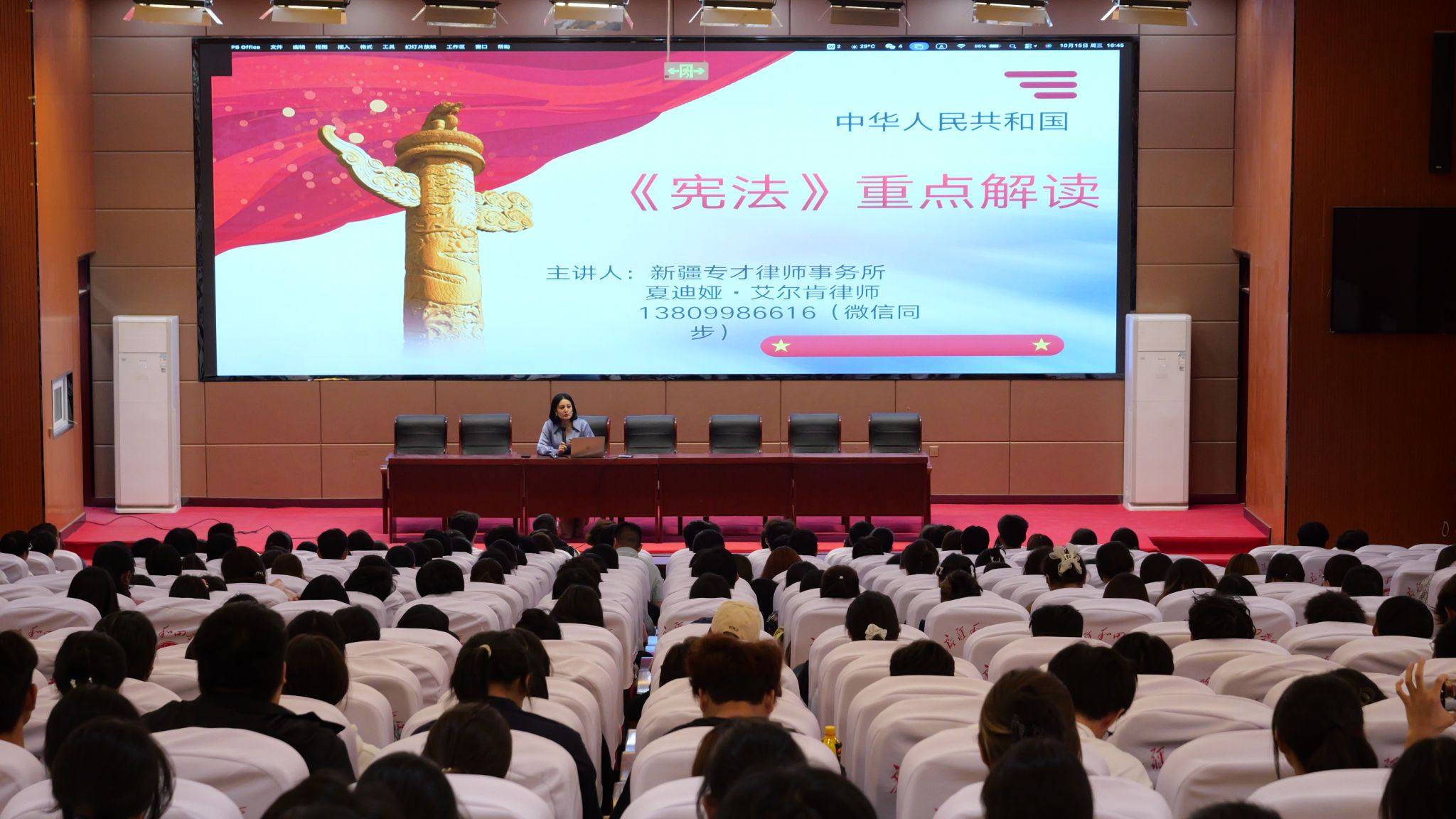 为深入学习宣传《中华人民共和国法治宣传教育法》,弘扬社会主义法治精神,根据我校专项活动安排,10月15日,学校特邀新疆专才律师事务所夏迪娅·艾尔肯律师在昆仑路校区涵德楼报告厅,为师生代表作了题为《宪法》重点解读的专题讲座。 本次专题授课是“五个一”活动中的重要一环。讲座中,夏迪娅紧扣青少年身心发展规律与认知特点,以宪法教育为核心,深入浅出地讲解了公民的基本权利与义务等核心内容。她结合生动案例,将法律知识与同学们在家庭、...