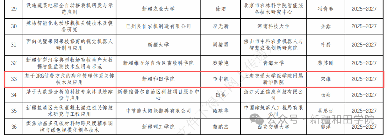 近日,自治区科学技术厅对2025年区域协同创新专项—“科技援疆”计划项目拟立项名单进行公示。我校临床医学院党总支书记李中凯教授申报的《基于DRG付费方式的病种管理体系关键技术及应用》项目成功入选,实现我校在该类项目上的首次突破。