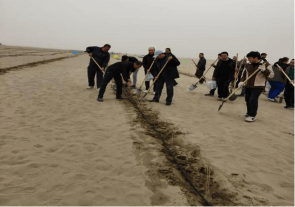 上午10时许,植树现场一派热火朝天的劳动景象。我校干部职工们热情高涨、干劲十足,严格遵循科学种植规范,按照“三埋二踩一提苗”的技术步骤,挥锹铲土、扶树填坑、培土围堰,每一个环节都一丝不苟、配合默契。大家分工协作,有的搬运树苗,有的扶正定根,有的挥锹培土,现场井然有序。经过一整天的辛勤劳动,累计完成1050余米种植带的铺设,一株株沙枣树苗在沙漠边缘整齐挺立,为广袤的防沙治沙项目区增添了盎然绿意。