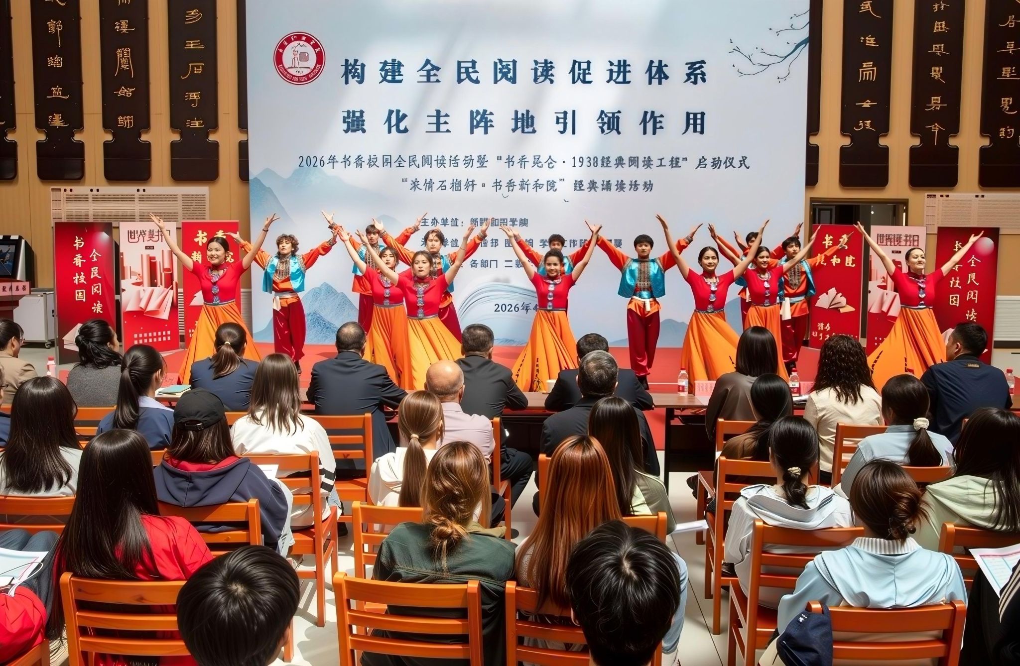 校党委常委、宣传部部长王继青宣布新疆和田学院2026年书香校园全民阅读活动暨“书香昆仑·1938经典阅读工程”启动,并结合学校1938年办学历史,阐释“书香昆仑·1938经典阅读工程”内涵,倡导师生从38部经典书目中汲取精神养分,养成终身阅读的良好习惯。
