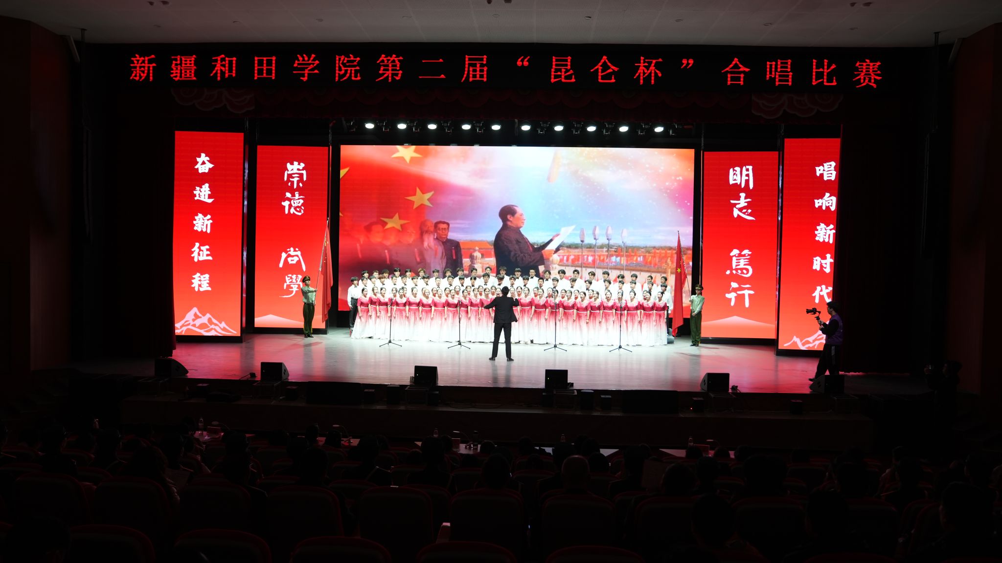 12月3日下午,新疆和田学院第二届“昆仑杯”合唱比赛在和田县影剧院启幕。校党委副书记、院长王志坚等校领导出席活动,与广大师生共同沉浸于这场融美育熏陶与思政教育于一体的文化盛宴之中,见证青年学子以歌声抒发爱国情、凝聚奋斗志。活动由学校团委主办,党委宣传部、教务处、学生工作部、艺术学院、图书馆协办。活动以“奋进新征程·唱响新时代”为主题,旨在深入推进中华民族共同体建设,推广国家通用语言文字使用,引导青年学子在艺术实践中重温红色记忆、...