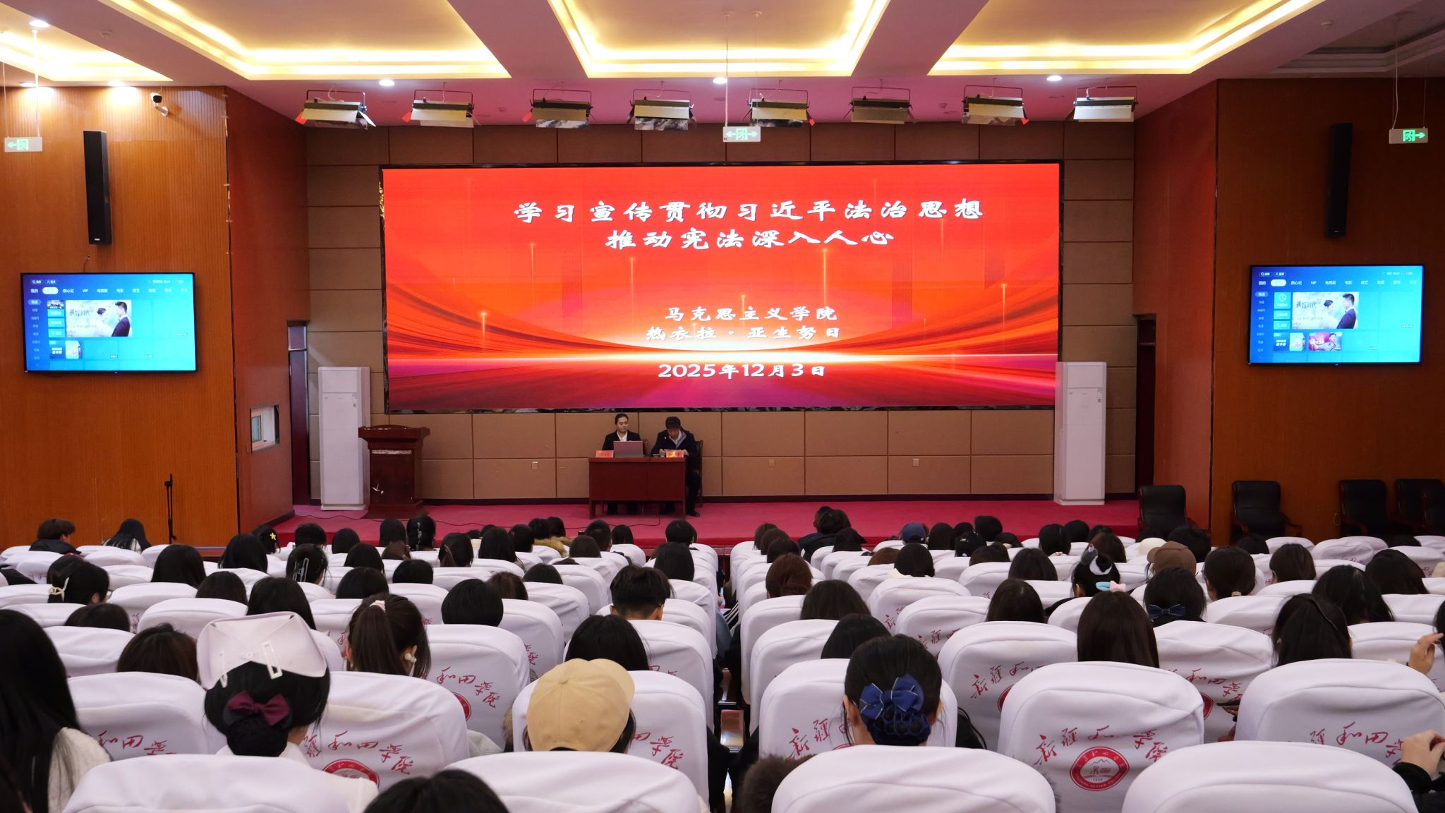在第十二个国家宪法日来临之际,为深入学习宣传贯彻习近平法治思想,切实推动宪法精神在校园落地生根,12月3日,学校在昆仑路校区涵德楼报告厅举办《学习宣传贯彻习近平法治思想 推动宪法深入人心》专题讲座。马克思主义学院副教授热衣拉·亚生努日受邀担任主讲人,全校师生代表齐聚现场,共同接受一场深刻的法治精神洗礼。今年12月4日是我国第十二个国家宪法日,中央宣传部、司法部、全国普法办已联合部署开展以“学习宣传贯彻习近平法治思想,...